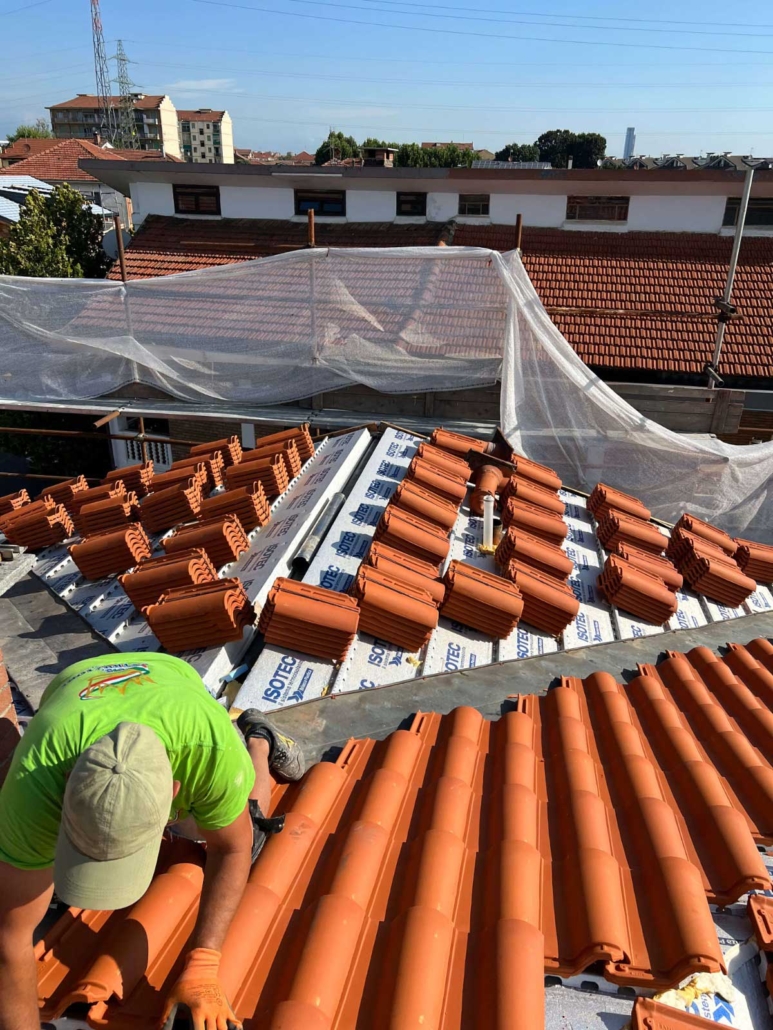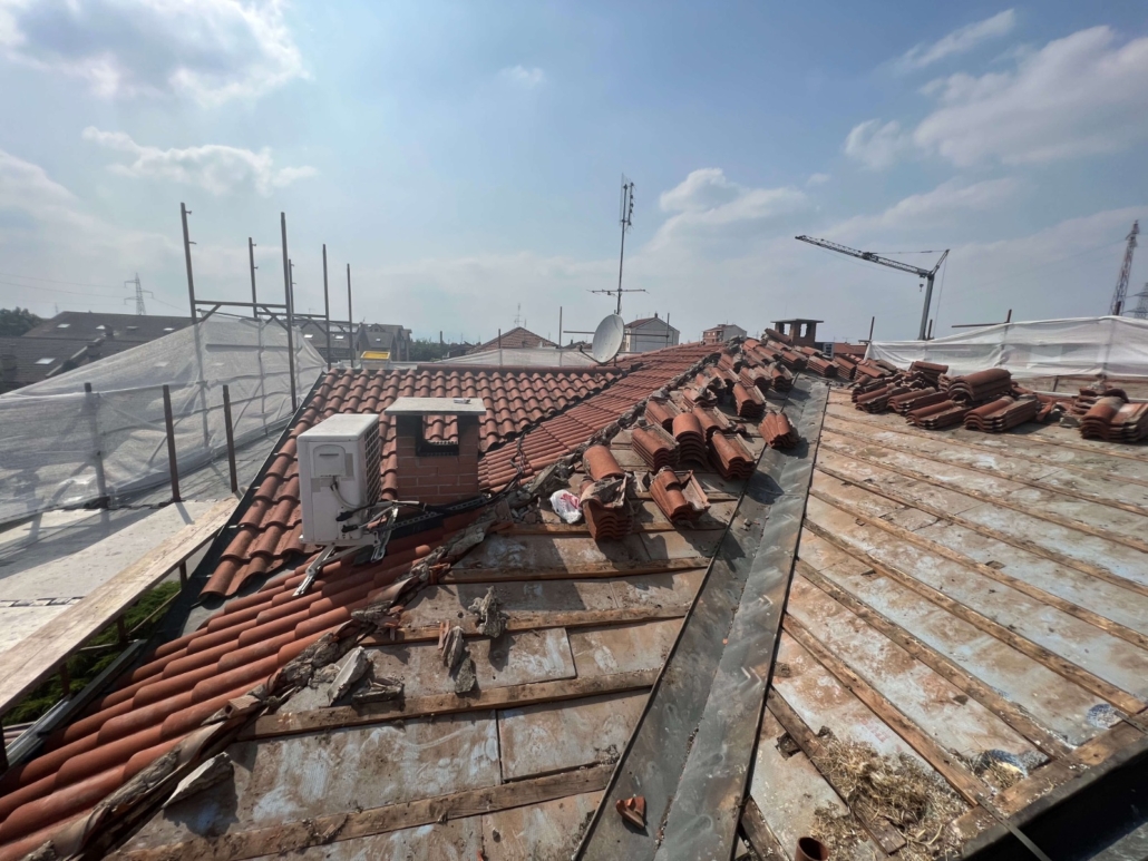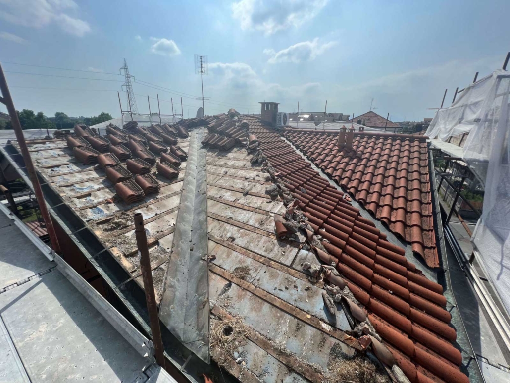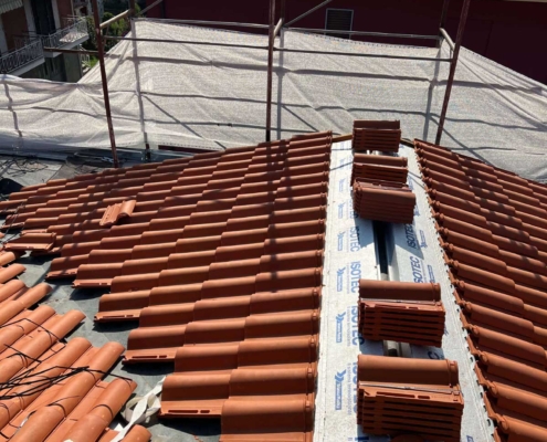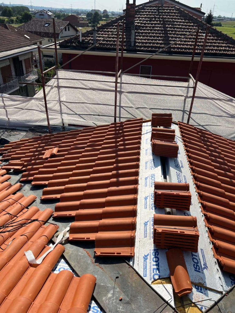- Rifacimento completo del manto di copertura mediante rimozione delle vecchie tegole, posa di barriera a vapore e pannelli isolanti in poliuretano espanso rigido del tipo ISOTEC sp. 12 cm. Completamento della copertura mediante nuove tegole portoghesi;