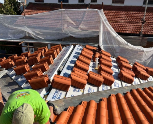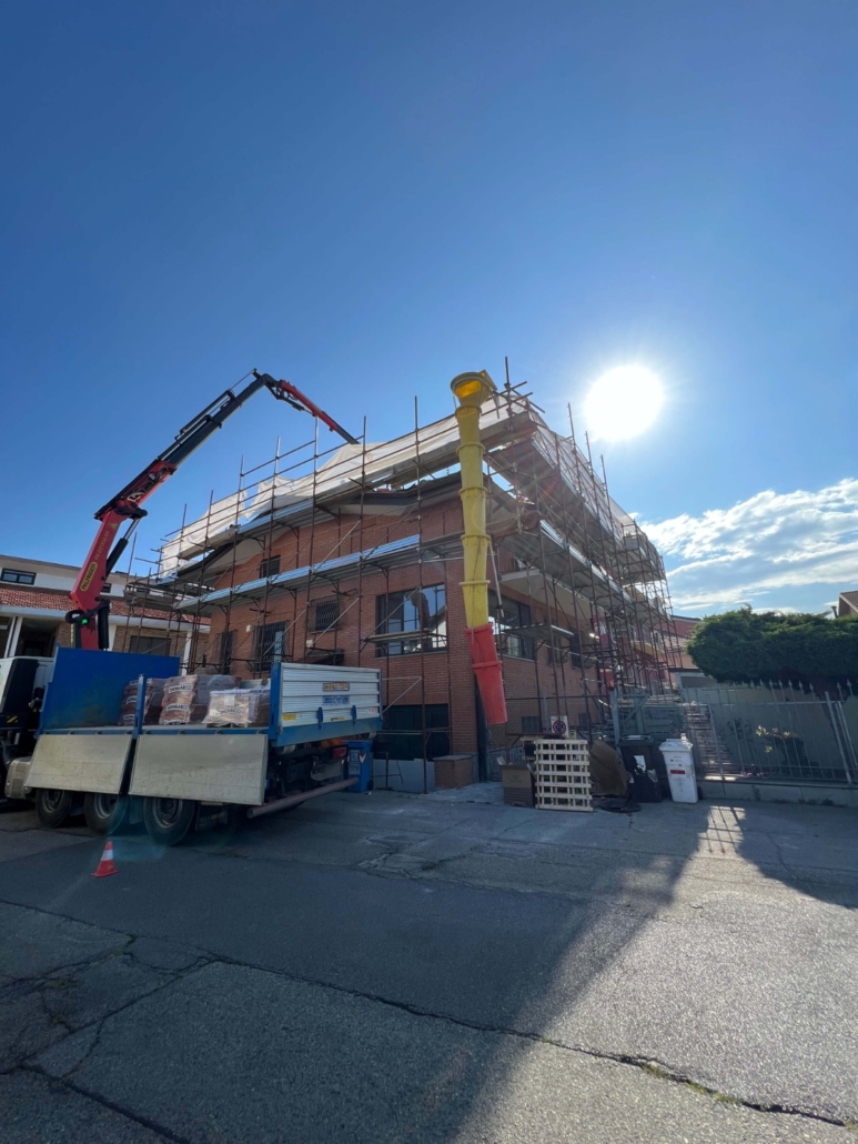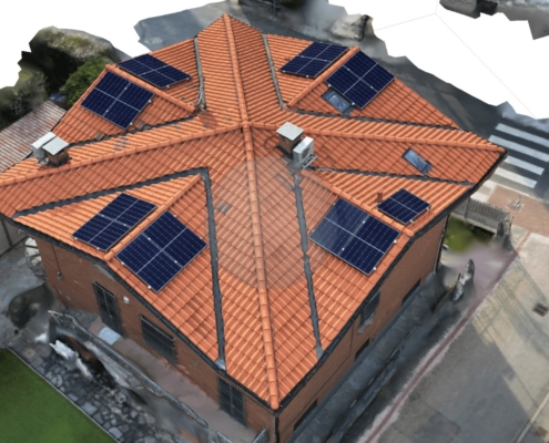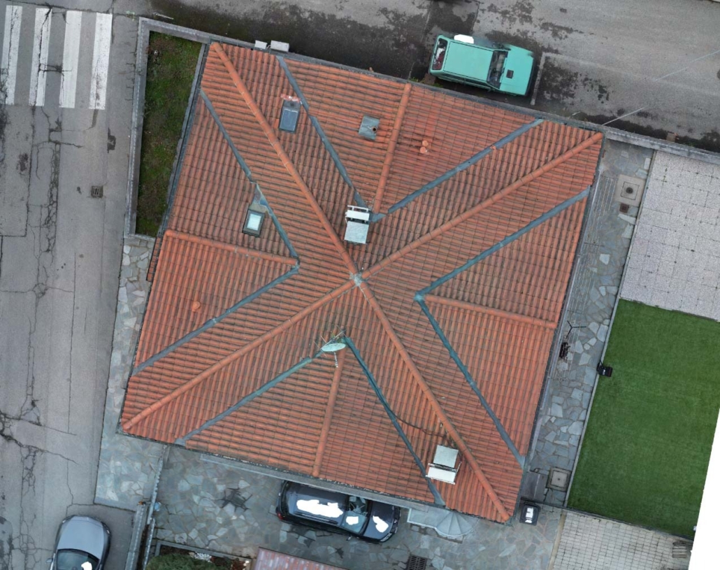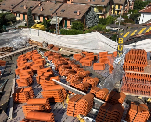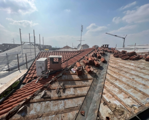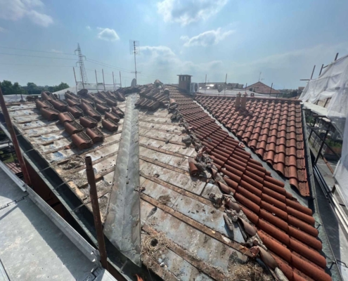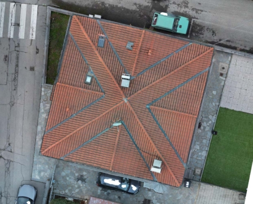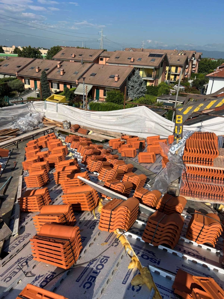 - Rifacimento completo del manto di copertura mediante rimozione delle vecchie tegole, posa di barriera a vapore e pannelli isolanti in poliuretano espanso rigido del tipo ISOTEC sp. 12 cm. Completamento della copertura mediante nuove tegole portoghesi;